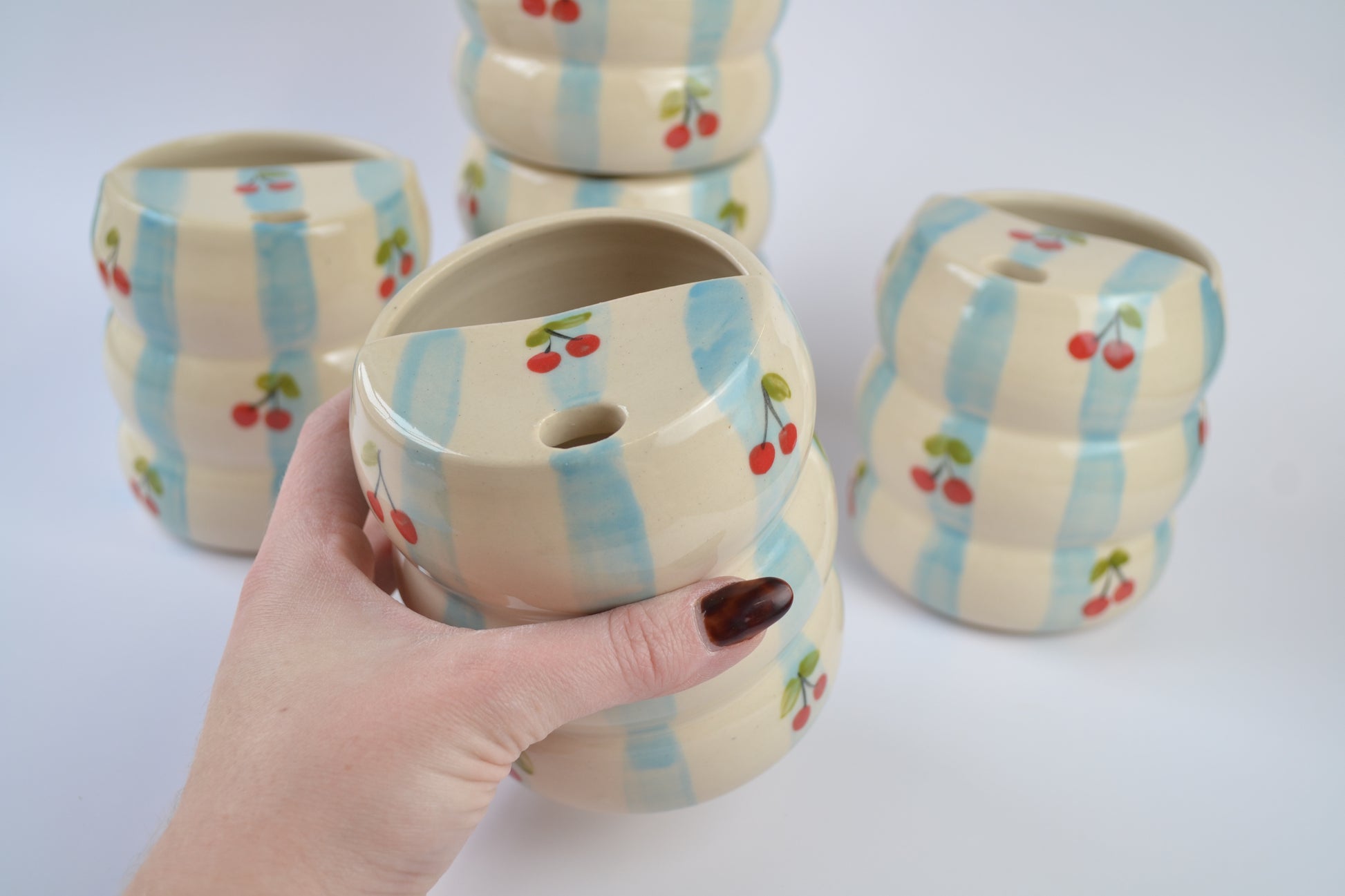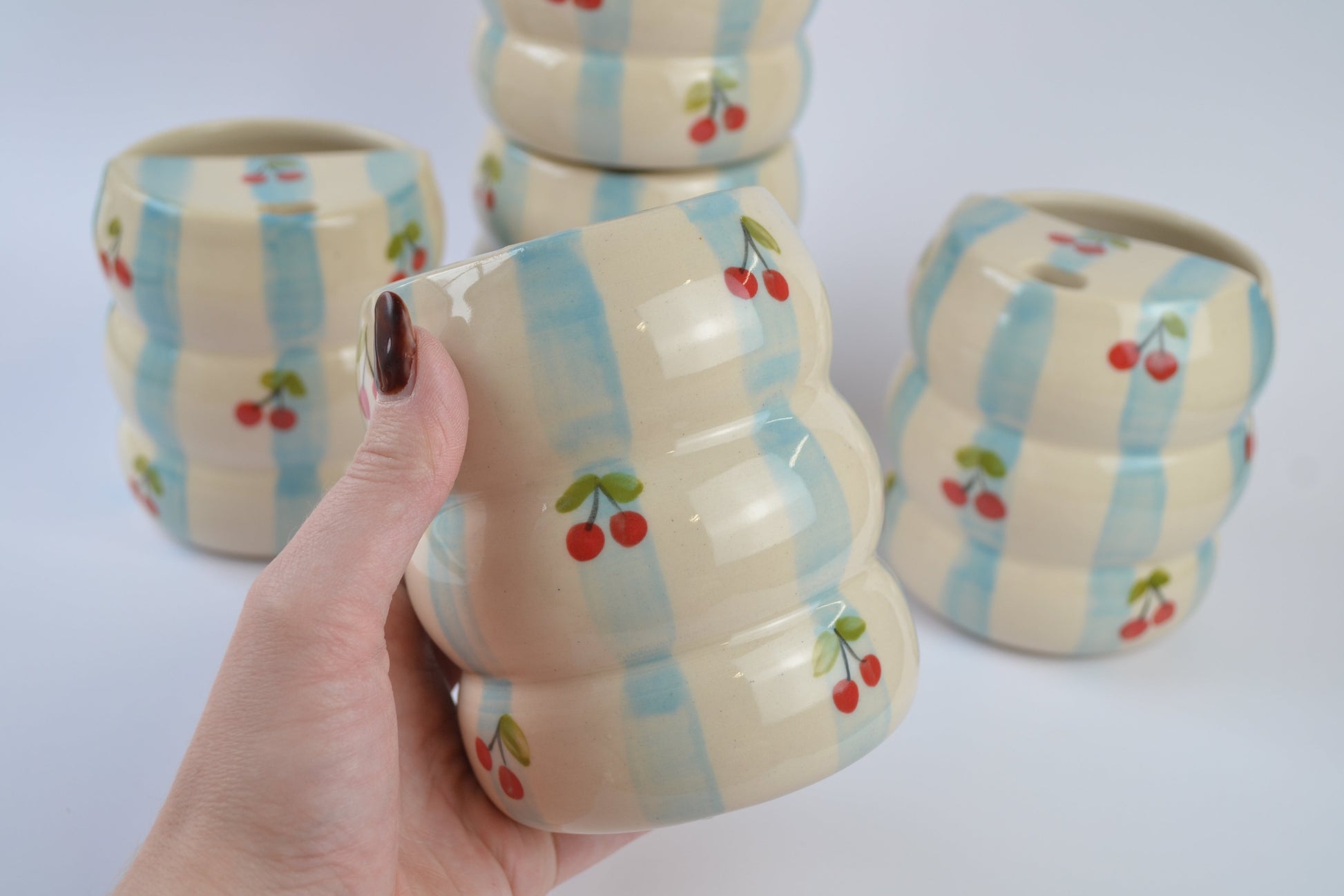 Sip your coffee or cocktail out of this fun tumbler! This cup is handmade and hand-painted with blue stripes and tiny cherries. It features a half lid with a sipping hole for convenient travel. Holds about 14oz, dishwasher and microwave safe.