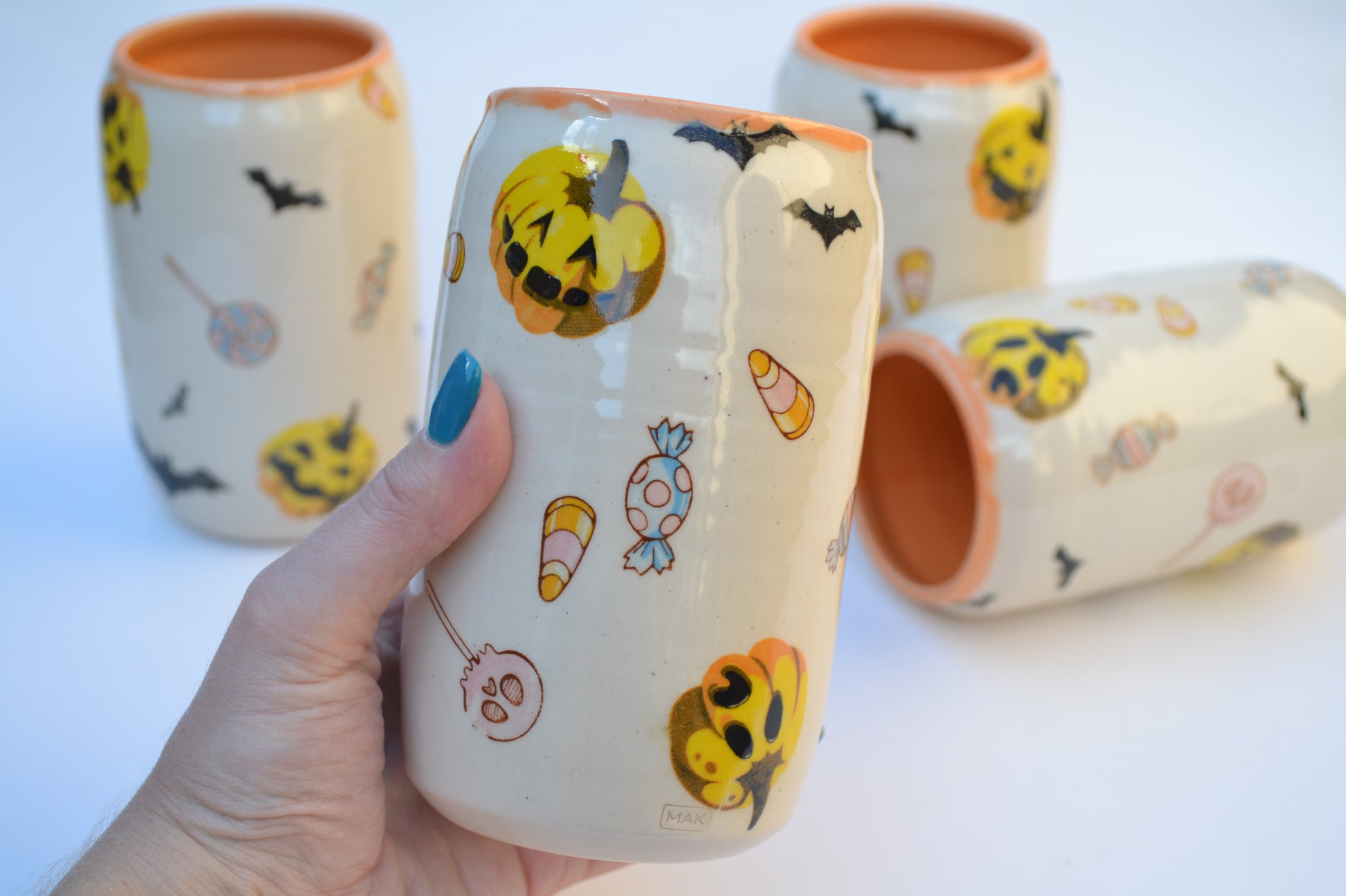 Sip your coffee or cocktail out of the cutest Halloween tumbler! This cup is handmade and features images of pumpkins, bats, and candy and is lined with an orange glaze. It holds about 10oz and is dishwasher and microwave safe.