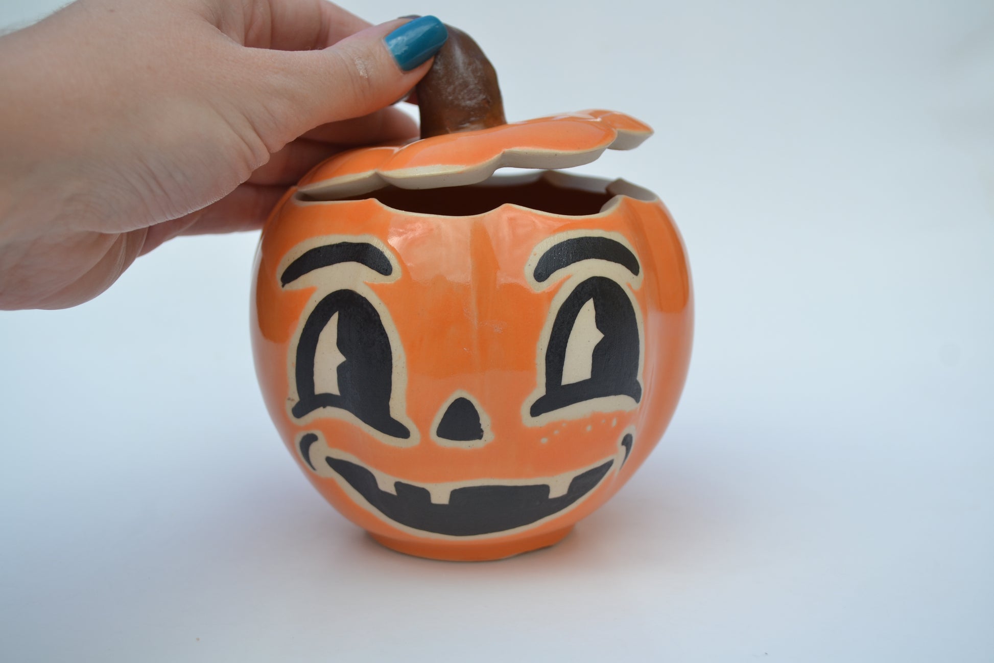 The perfect jar to keep your knick knacks or Halloween candy in and use year after year! This jar is hand-painted with an adorable retro face. Dishwasher and microwave safe. Measures about 5 inches tall and 4 inches wide.